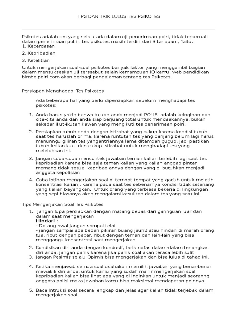 Contoh soal psikotest bagian 1 tes baum (tree test) bagian 2 htp (house tree person) test bagian 3 draw a person bagian 4 menggambar obyek bagian 5 wartegg bagian 6 kraeplien/pauli. Video ini berisi info seputar tes psiko kepribadian, tes psikotes kepribadian, psiko 1 polri, psikotes 1 polri. Melaporkan kejadian tersebut kepada pimpinan dan siap menerima hukuman/petunjuk dari pimpinan. Dalam contoh soal psikotest bisa dilihat bahwa bentuk tes ini sangat bervariasi. Anda ingin tahu contoh soal latihan psikotest dan pembahasannya?